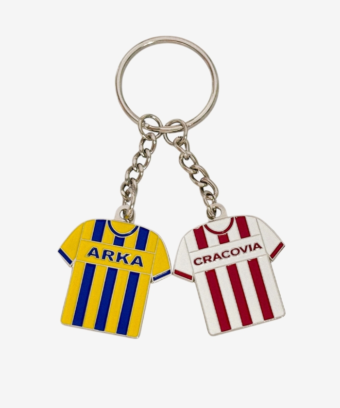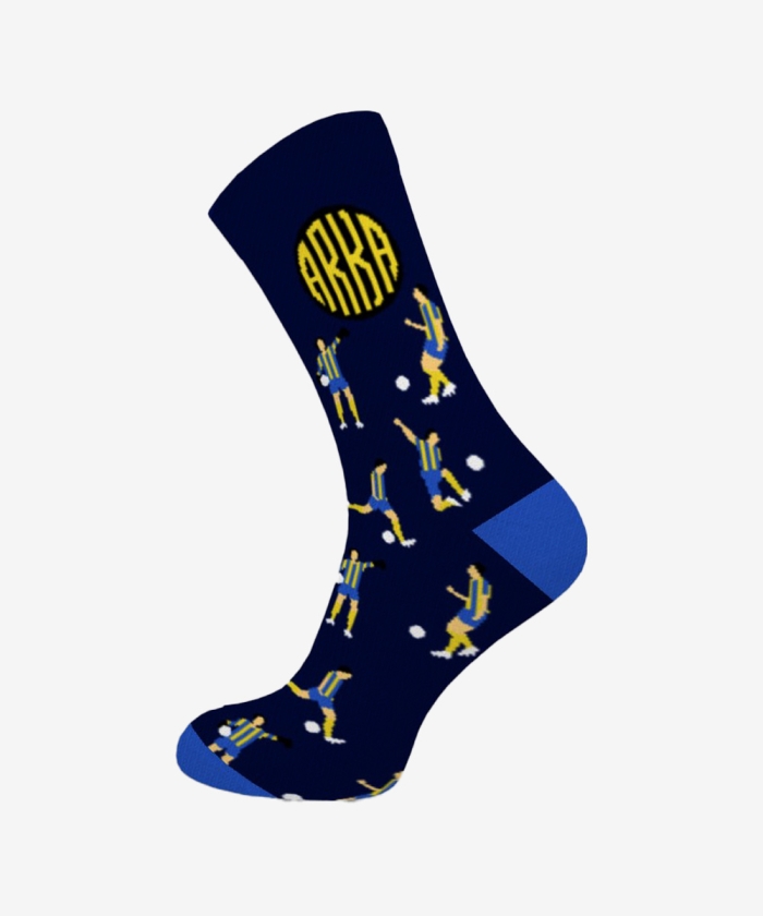 Granatowe tło w połączeniu z żółto-niebieskimi detalami oraz dynamicznym wzorem piłkarzy w akcji sprawia, że skarpety wyróżniają się i od razu przyciągają wzrok. Okrągłe logo „ARKA” podkreśla kibicowski charakter produktu.