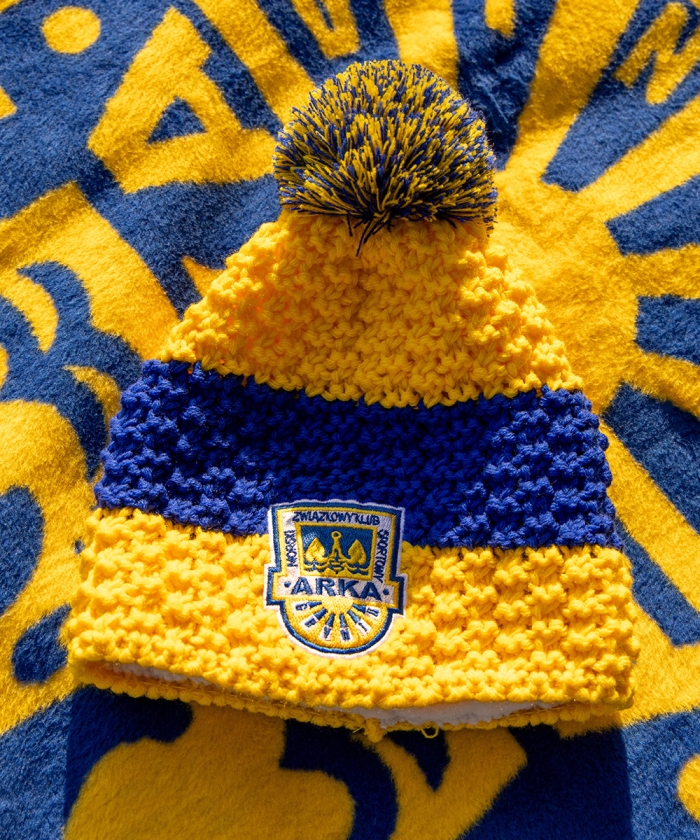Czapka utrzymana jest w charakterystycznej żółto-niebieskiej kolorystyce, a jej centralnym punktem jest haftowany herb Arki Gdynia umieszczony z przodu. Całość dopełnia efektowny pompon, który nadaje czapce klasycznego, kibicowskiego stylu.
