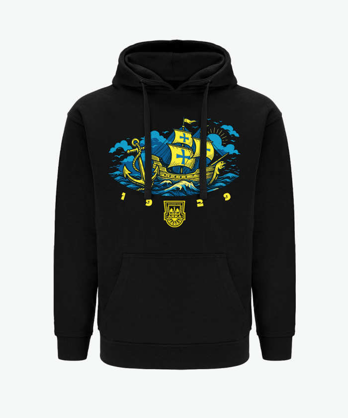 Czarna koszulka Arki Gdynia inspirowana jest morskimi korzeniami klubu i jego niepowtarzalnym charakterem. Centralna grafika przedstawiająca żaglowiec na wzburzonych falach symbolizuje siłę, determinację i drogę, jaką Arka Gdynia pokonuje od momentu założenia w 1929 roku. Motyw kotwicy podkreśla przywiązanie do tradycji i miasta portowego.