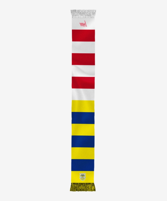 Po lewej stronie znajduje się herb Arki Gdynia, symbolizujący dumę i historię klubu. Po prawej stronie umieszczony jest czarny gryf kaszubski na żółtym tle – historyczny znak regionu Kaszub, podkreślający lokalną tożsamość i przywiązanie do pomorskich korzeni.